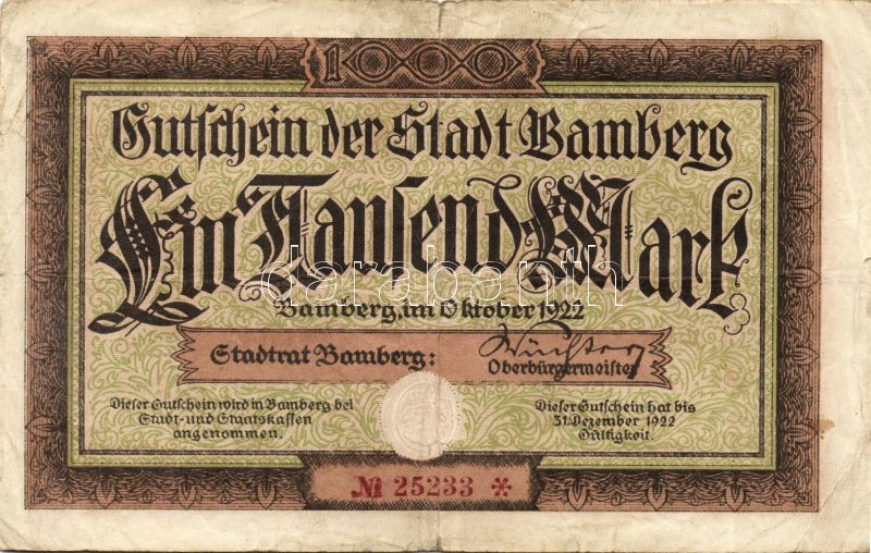 Német Birodalom/Weimari Köztársaság/Bamberg 1922.10. 1000M T:III https://www.darabanth.com/de/103-Fernauktion/103.0/Numismatik/~40006/Nemet-BirodalomWeimari-KoztarsasagBamberg-192210-1000M-TIII~II249941