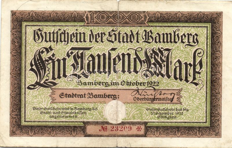 Német Birodalom/Weimari Köztársaság/Bamberg 1922.10. 1000M T:III https://www.darabanth.com/de/103-Fernauktion/103.0/Numismatik/~40006/Nemet-BirodalomWeimari-KoztarsasagBamberg-192210-1000M-TIII~II249942