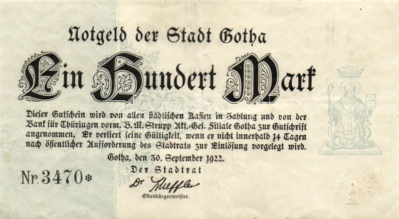 Beschreibung: Német Birodalom/Weimari Köztársaság/Gotha 1922.09.30. 100M jobboldali értékjelzés nélkül, vékony papíron T:II/III+