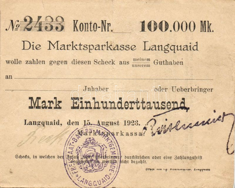 Beschreibung: Német Birodalom/Weimari Köztársaság/Langquaid 1923.8.15. 100.000M T:II/III