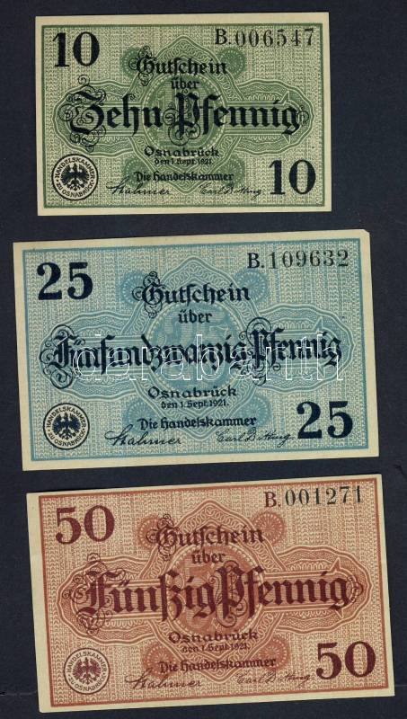 Német Birodalom/Weimari Köztársaság/Osnabrück 1921. 10Pf + 25Pf + 50Pf... https://www.darabanth.com/de/103-Fernauktion/103.0/Numismatik/~40006/Nemet-BirodalomWeimari-KoztarsasagOsnabruck-1921-10Pf-plus-25Pf-plus-50Pf-3klf-db-teljes-sor-TI~II248087