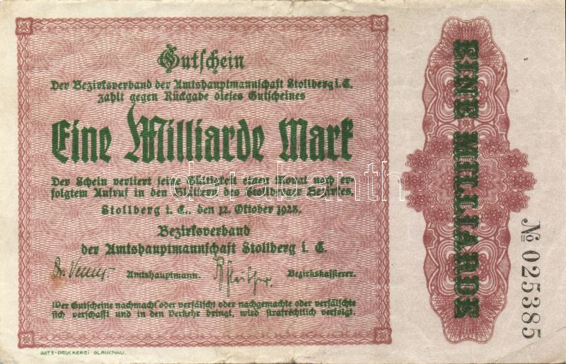 Beschreibung: Német Birodalom/Weimari Köztársaság/Stollberg 1923.10.12. 1000.000.000M T:III