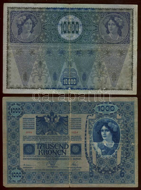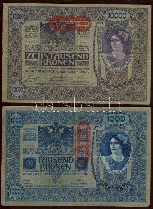 1902-1915. 1K, 2K, 10K, 100K, 1000K piros ill. fekete "Deutschösterreich" fny-sal T:II,III/IV + Ausztria/Osztrák-Magyar Bank 10.000K piros "Deutschösterreich" fny-sal T:III, összesen 6 klf bankjegy
