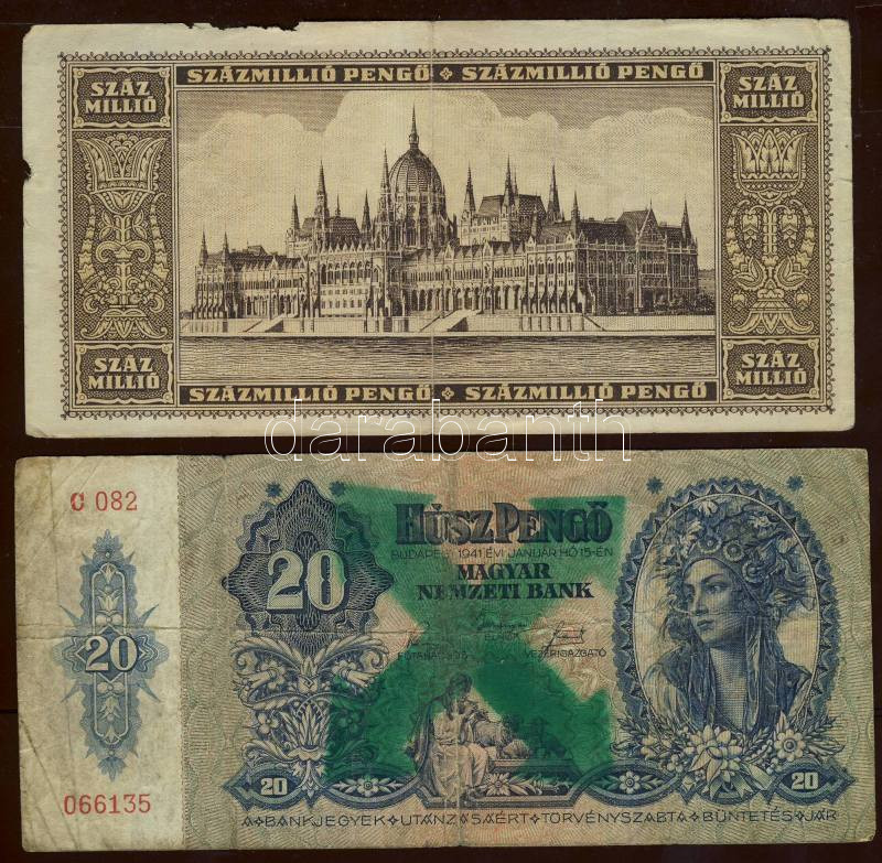 1941. 20P zöld nyilaskereszt bélyegzővel T:III + 1946. 100 millió P fe... https://www.darabanth.com/de/103-Fernauktion/103.0/Numismatik/~40008/1941-20P-zold-nyilaskereszt-belyegzovel-TIII-plus-1946-100-millio-P-fekete-Nemet-3-Birodalom-~II252539