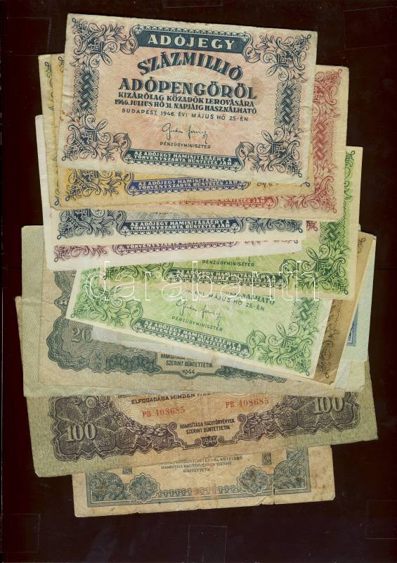 1944. "V.H." tétel: 1P, 2P, 5P, 20P, 50P, 100P T:II+, III, III/IV + 1946. Adópengős tétel: 10.000AP (2 klf), 50.000Ap (2 klf), 100.000AP (2 klf), 500.000AP, 1 millió Ap, 10 millió AP (2 klf), 100 millió AP, összesen 17 klf bankjegy T:II, II/III, III, III/IV