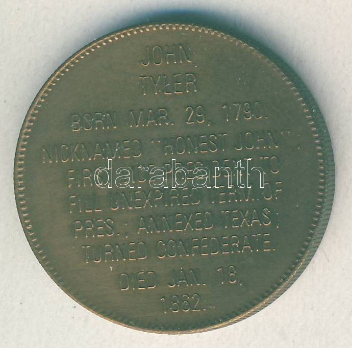 USA DN "Egyesült Államok elnökei-John Tyler" emlékérem T:2 https://www.darabanth.com/de/103-Fernauktion/103.0/Numismatik/~40011/USA-DN-Egyesult-Allamok-elnokei-John-Tyler-emlekerem-T2~II247010