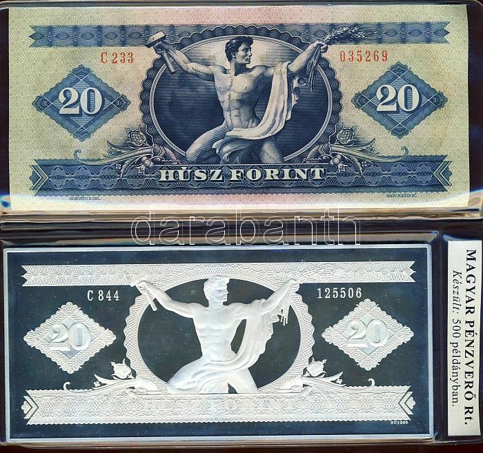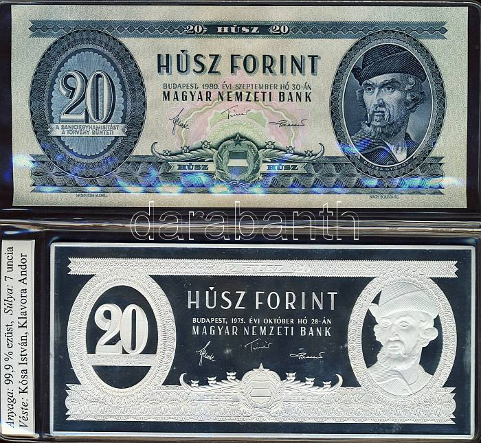 1975. 20Ft-os bankjegy Ag imitációja 7oz/217,73g T:PP hozzá 1980. 20Ft T:I Egyben, eredeti vákumcsomagolásban, beforrasztott tanúsítvánnyal! RR!! Csak 500db!