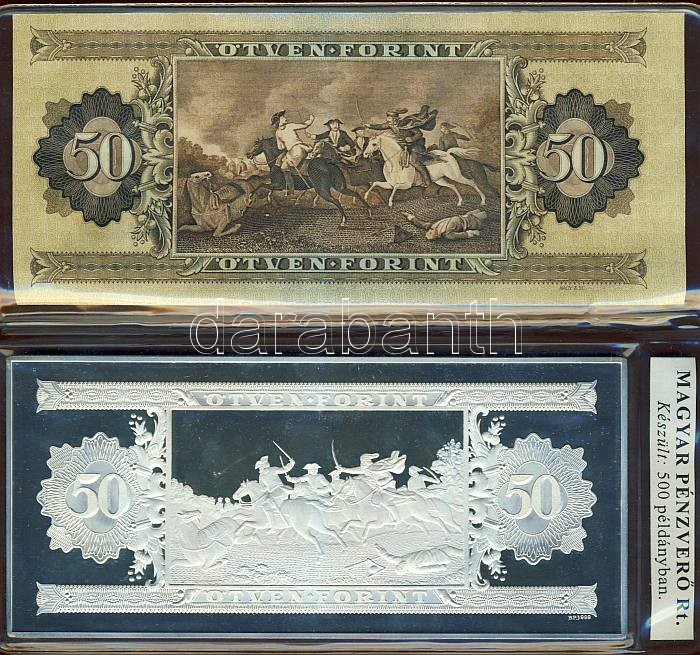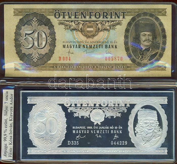 1989. 50Ft-os bankjegy Ag imitációja 7oz/217,73g T:PP hozzá 1983. 50Ft T:I Egyben, eredeti vákumcsomagolásban, beforrasztott tanúsítvánnyal! RR!! Csak 500db!