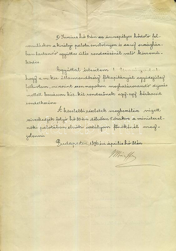 Beschreibung: 1896 Bánffy Dezső miniszterelnök aláírása levélen (szakadások)