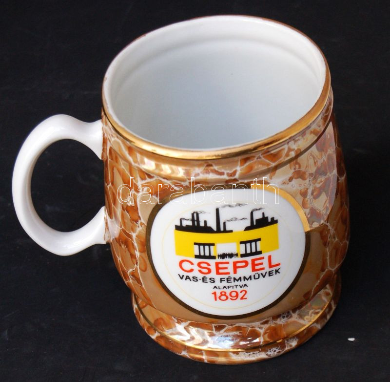 Beschreibung: Díszes hollóházi porcelán söröskorsó Csepel művek reklámmal, sorszámmal