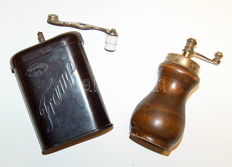 Beschreibung: Fából készült rézkarú borsdaráló és egy század közepén készített műanyag Tramp márkájú kávédaráló