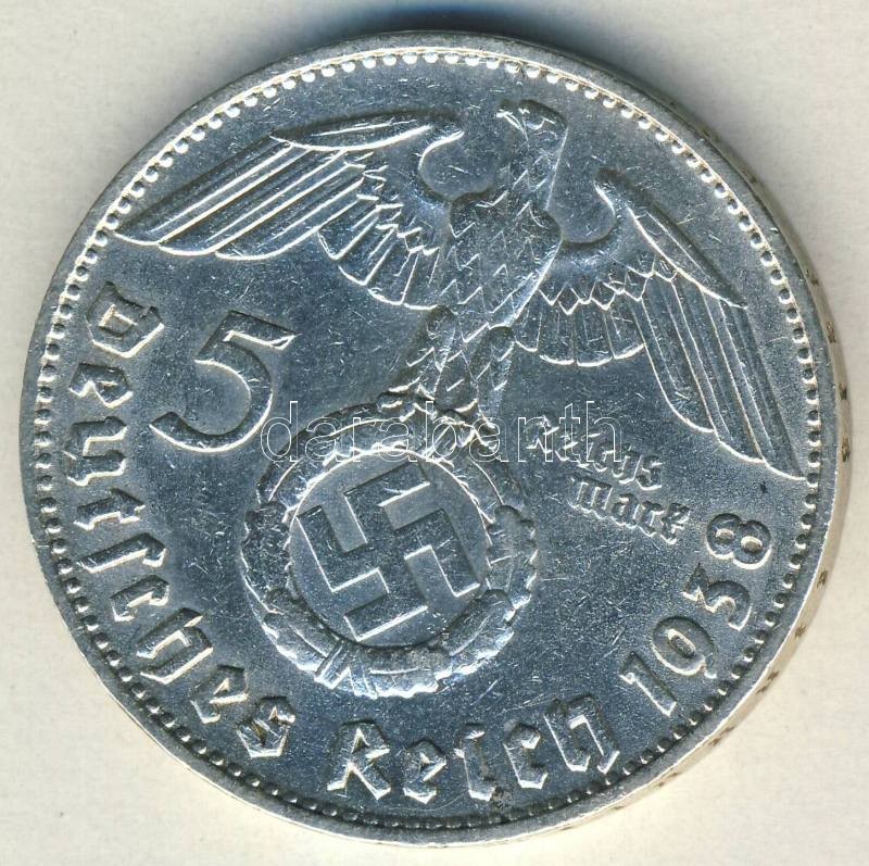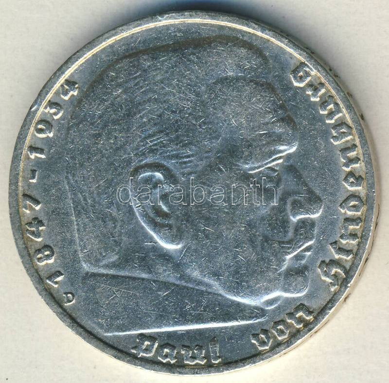 Beschreibung: Német 3. Birodalom 1938D 5M Ag "Hindenburg" nagy h.k.-tel T:2/3 ph.