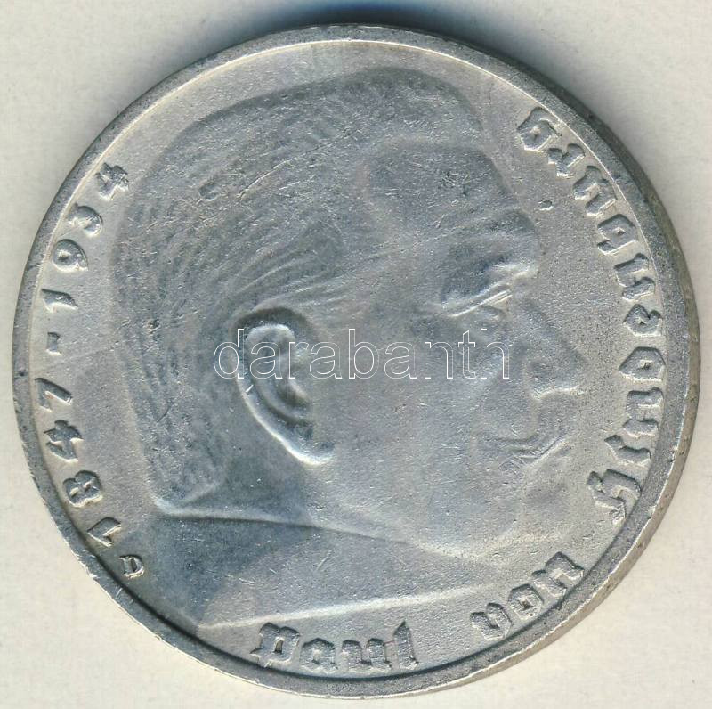 Beschreibung: Német 3. Birodalom 1938D 5M Ag "Hindenburg" nagy h.k.-tel T:3 foltos