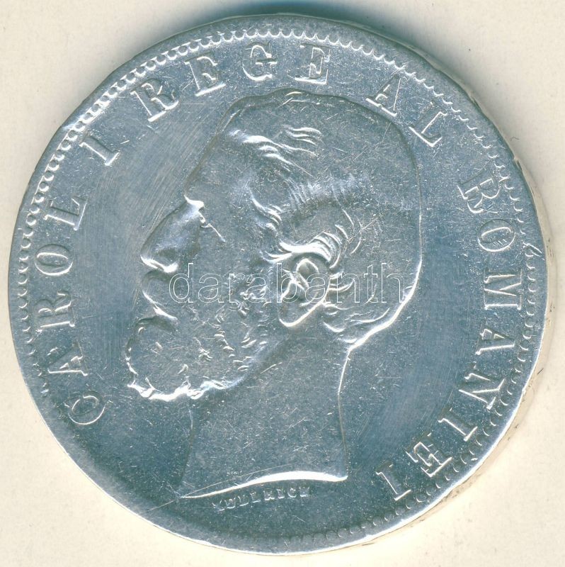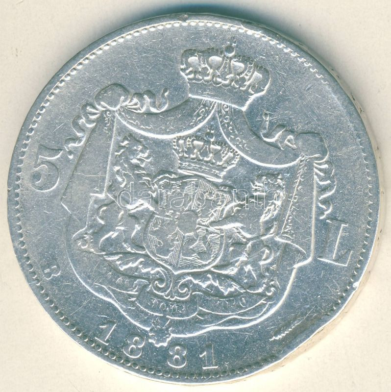 Románia 1881. 5L Ag "5*" a peremen I.Károly T:3 ph. https://www.darabanth.com/de/105-Fernauktion/105.0/Numismatik/~500015/Romania-1881-5L-Ag-5-a-peremen-IKaroly-T3-ph~II256416