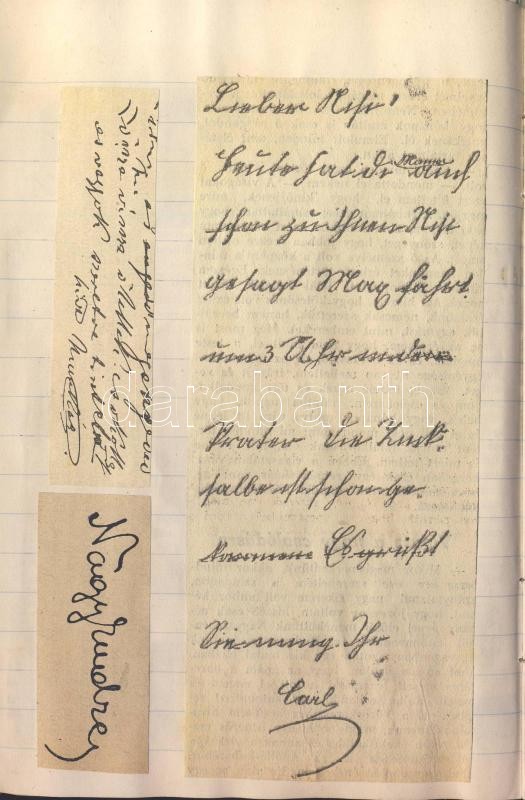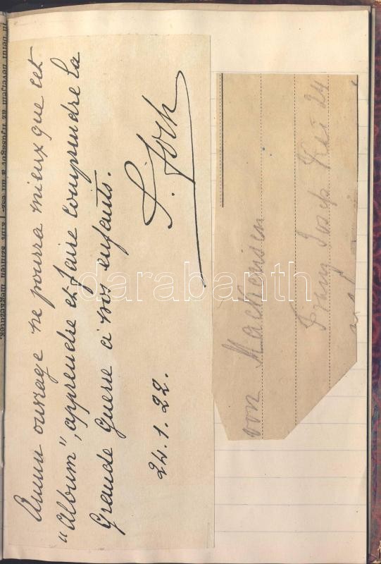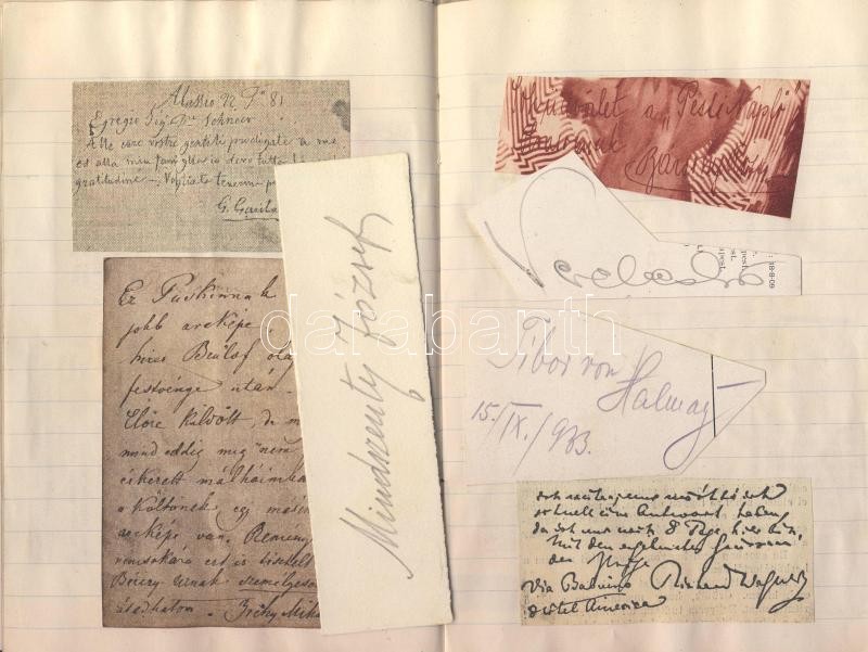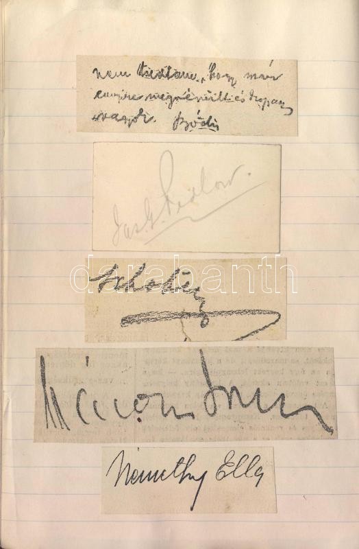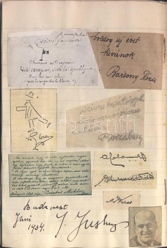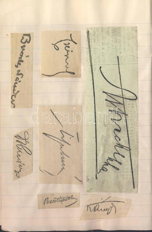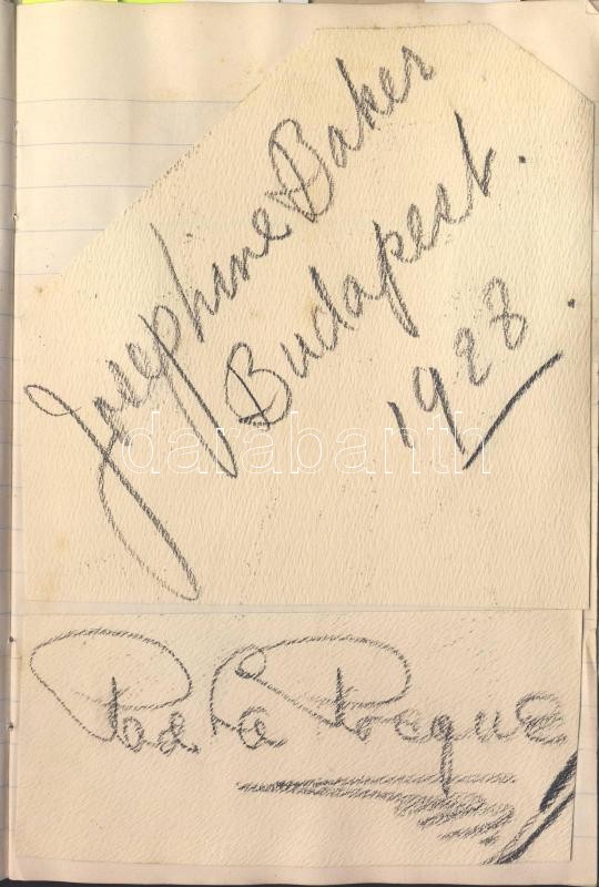 Aláírás-gyűjtemény az 1920-as évekből. Josephine Baker, Rákosi Szidi, Somlay Artúr, von Mackensen, Mindszenty József, Bársony Rózsi, Emőd Tamás, Nagy Endre, Molnár Jenő és más hírességek saját kezű aláírásai kis füzetben felragasztva rengeteg nyomtatott aláírás társaságában.