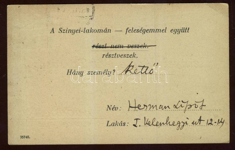 Beschreibung: 1926 Hermann Lipót festőművész aláírása a Színyei Társaság meghívóján