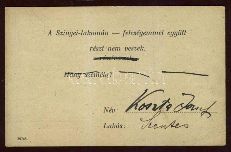 Beschreibung: 1926 Koszta József festőművész aláírása a Színyei Társaság meghívóján