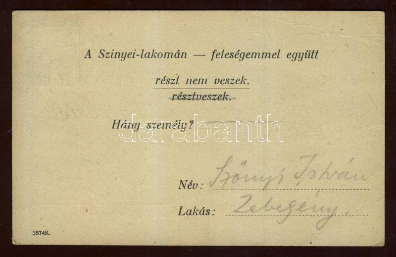 Beschreibung: 1926 Szőnyi István festőművész aláírása a Színyei Társaság meghívóján