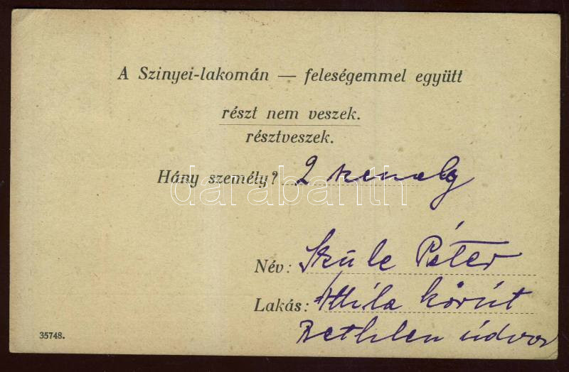 Beschreibung: 1926 Szüle Péter festőművész aláírása a Színyei Társaság meghívóján