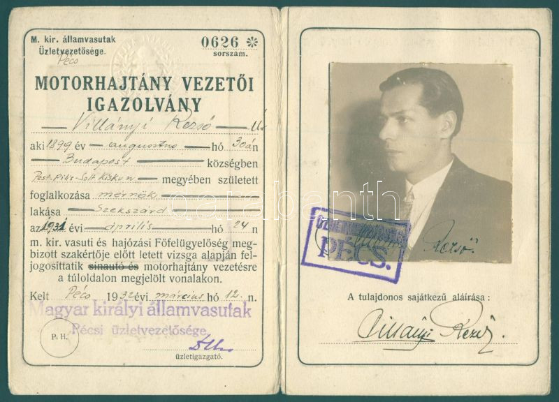 1932 MÁV. Fényképes motorhajtány vezetői igazolvány https://www.darabanth.com/de/108-Fernauktion/108.0/Andere-Sammelgebiete/~319/1932-MAV-Fenykepes-motorhajtany-vezetoi-igazolvany~II265256