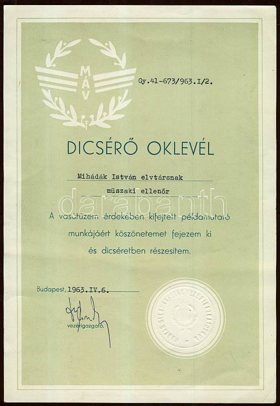 1963 Csanádi György MÁV vezérigazgató, közlekedési miniszter aláírása ... https://www.darabanth.com/de/108-Fernauktion/108.0/Andere-Sammelgebiete/~320/1963-Csanadi-Gyorgy-MAV-vezerigazgato-kozlekedesi-miniszter-alairasa-dicsero-oklevelen~II265853
