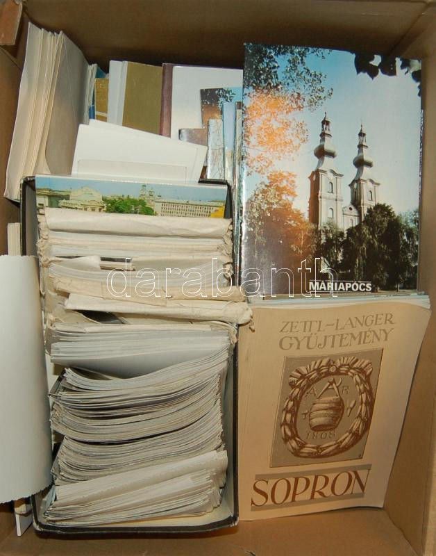 Kb 600 főleg magyar modern városképes lap, hozzá múzeumi ismertetők, kis fotóalbumok, a Tájak korok múzeumok sorozat kiadványai, utazásokon, kirándulásokon készült fotók, érdekes anyag