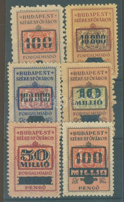 Beschreibung: 1945-46 Budapest Székesfőváros forgalmi adó átértékelt illetékbélyegek, 6 db klf, lyukasztás nélkül