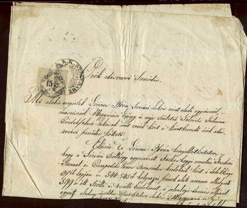 1858 Örök adásvevési szerződés 15kr C.M. okmánybélyeggel https://www.darabanth.com/de/109-Fernauktion/109.0/Andere-Sammelgebiete/~337/1858-Orok-adasvevesi-szerzodes-15kr-CM-okmanybelyeggel~II269850