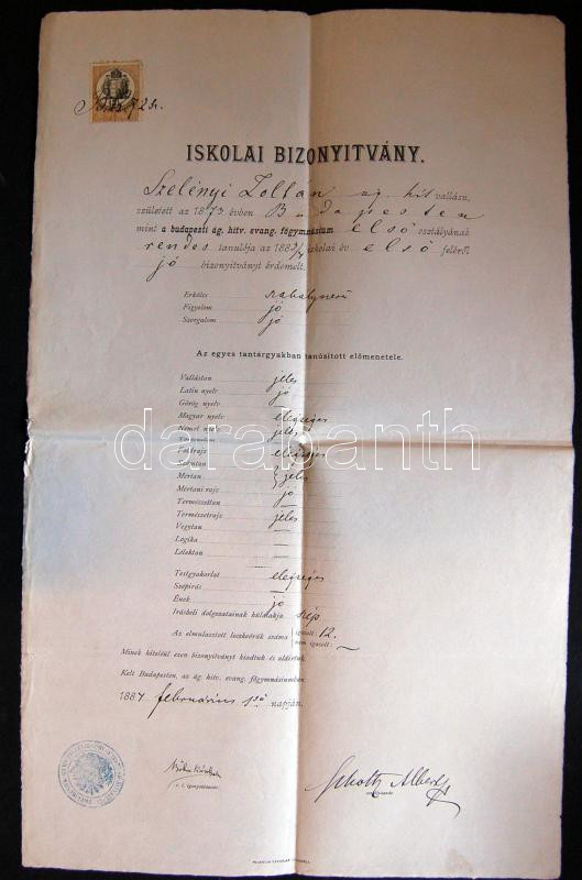 Beschreibung: 1884 Böhm Károly író, filozófus az MTA tagjának aláírása nagyalakú bizonyítványon