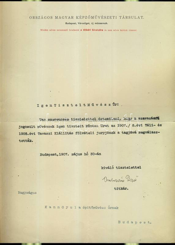 Beschreibung: 1907 Ambrozovics Dezső író, költő aláírása levélen