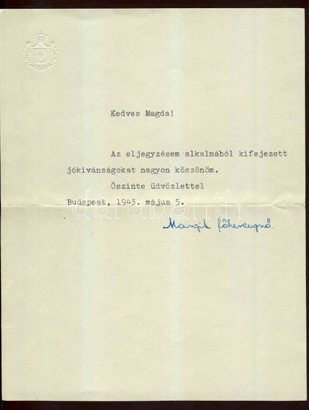 1943 Margit királyi hercegnő gratulációt megköszönő levele főhercegi levélpapíron és borítékban a hercegnő autográf aláírásával + az eljegyzésről tudósító újságcikk