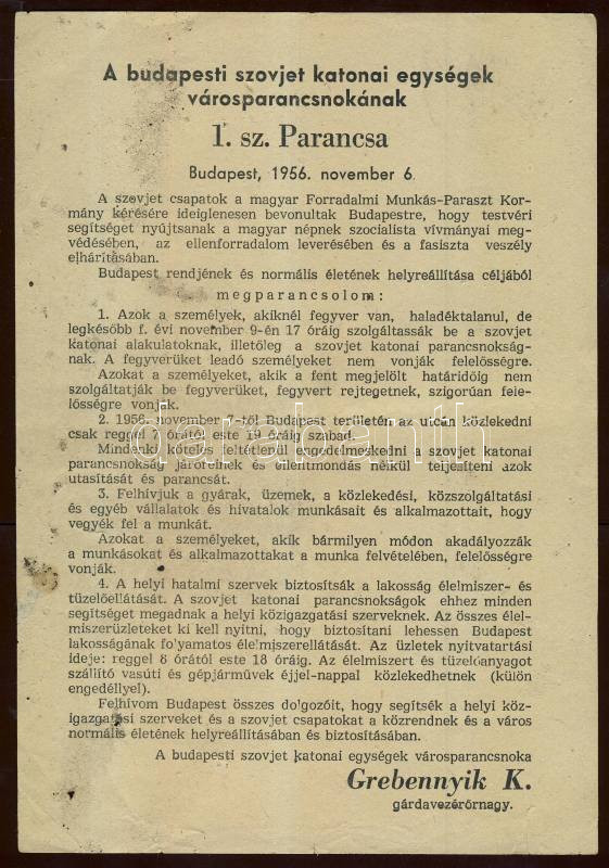 1956 november 6.-i első számú napiparancs https://www.darabanth.com/de/109-Fernauktion/109.0/Andere-Sammelgebiete/~344/1956-november-6-i-elso-szamu-napiparancs~II271555