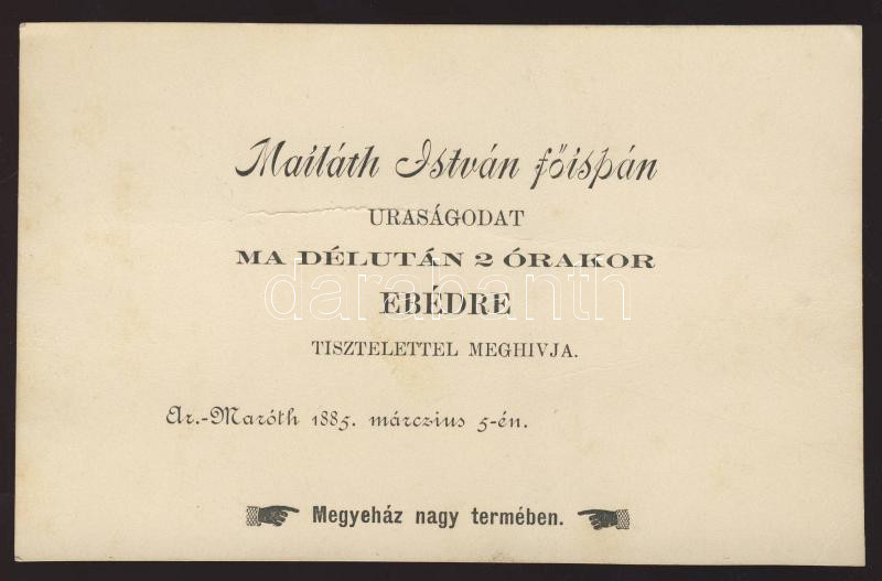 1885 Aranyosmarót meghívó Mailáth István főispán ebédjére https://www.darabanth.com/de/109-Fernauktion/109.0/Andere-Sammelgebiete/~346/1885-Aranyosmarot-meghivo-Mailath-Istvan-foispan-ebedjere~II273360