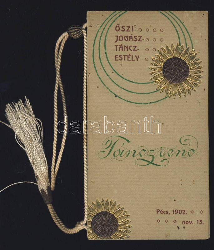 1902 A pécsi őszi jogász táncestély díszes "tánczrendje", kiváló állap... https://www.darabanth.com/de/109-Fernauktion/109.0/Andere-Sammelgebiete/~346/1902-A-pecsi-oszi-jogasz-tancestely-diszes-tanczrendje-kivalo-allapotban~II270218