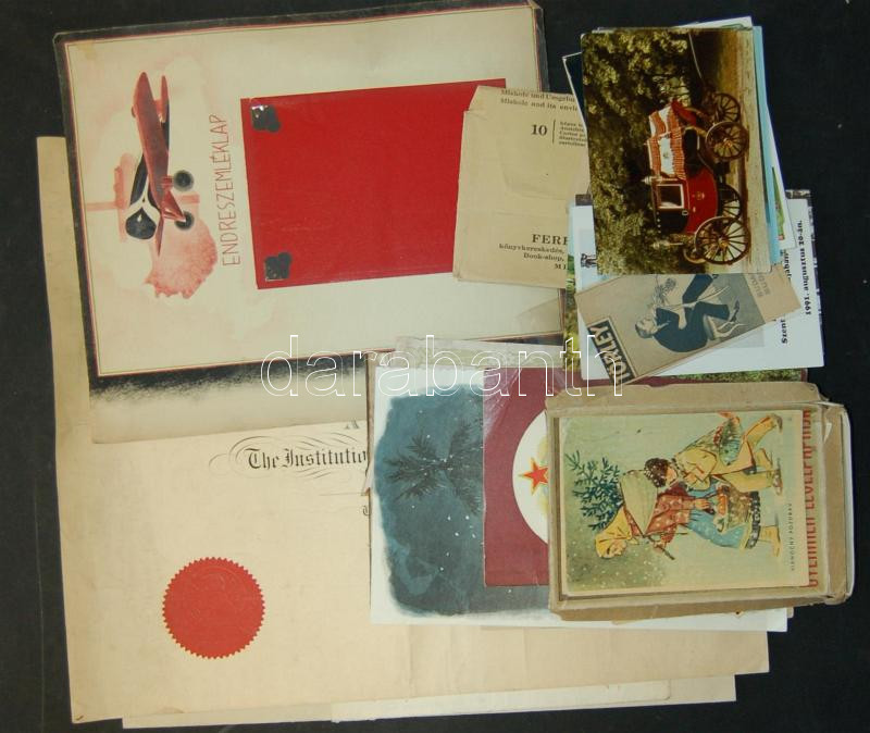 Beschreibung: Vegyes hagyaték nyomtatvány tétel: benne érdekes oklevelek, reklám, metszet összesen kb 35 darab