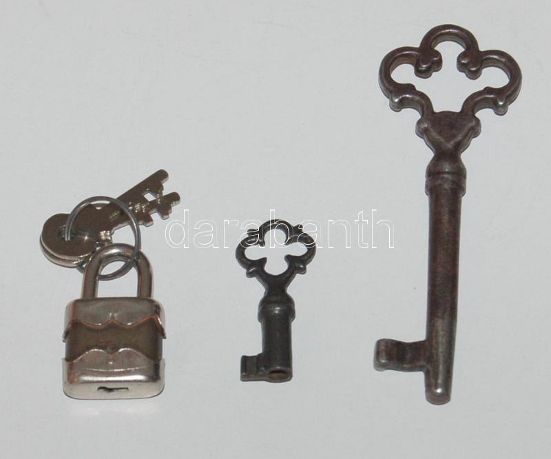 Beschreibung: Régi díszes pici és nagy kulcs illetve egy kis lakat, hozzávaló két kulcsával