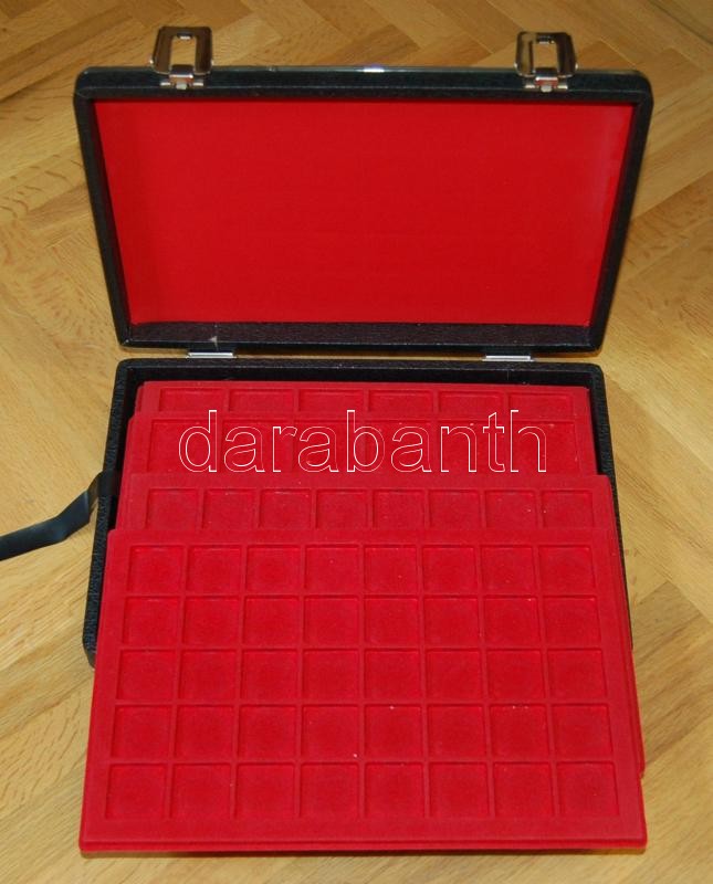 Beschreibung: Nagyalakú éremtartó koffer, 4x24, 2x40 férőhelyes tálcával, kulccsal, jó állapotban