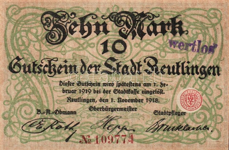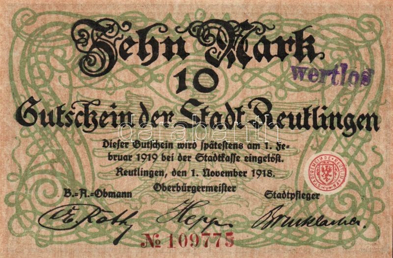 Német Birodalom/Császárság/Reutlingen 1918.11.1. 10M (5x) egymásutáni ... https://www.darabanth.com/de/109-Fernauktion/109.0/Numismatik/~364/Nemet-BirodalomCsaszarsagReutlingen-1918111-10M-5x-egymasutani-sorszammal-hivatalos-C3~II249900