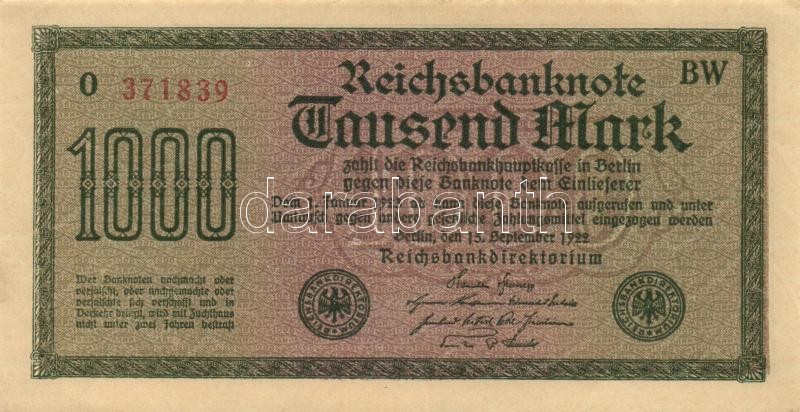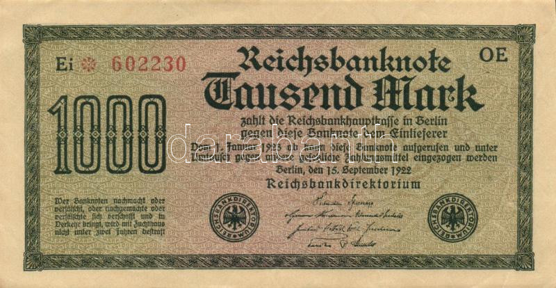 Német Birodalom/Weimari Köztársaság 1922. 1000M (2x) T:I- https://www.darabanth.com/de/109-Fernauktion/109.0/Numismatik/~364/Nemet-BirodalomWeimari-Koztarsasag-1922-1000M-2x-TI-~II271153