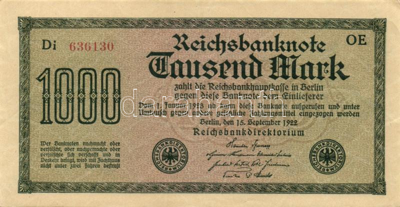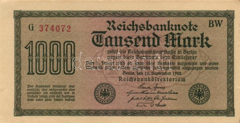 Német Birodalom/Weimari Köztársaság 1922. 1000M (2x) T:I- https://www.darabanth.com/de/109-Fernauktion/109.0/Numismatik/~364/Nemet-BirodalomWeimari-Koztarsasag-1922-1000M-2x-TI-~II271154