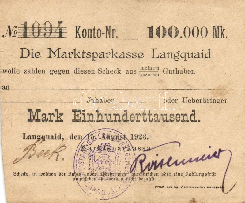 Német Birodalom/Weimari Köztársaság/Langquaid 1923.8.15. 100.000M T:II... https://www.darabanth.com/de/109-Fernauktion/109.0/Numismatik/~364/Nemet-BirodalomWeimari-KoztarsasagLangquaid-1923815-100000M-TIIIII~II249967
