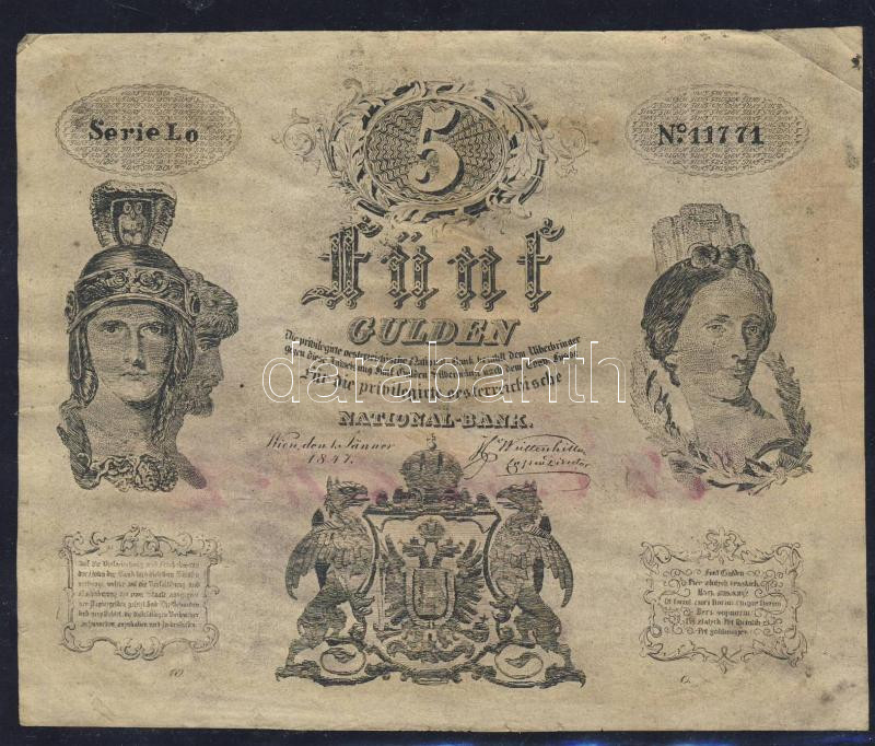 1847. 5G hamisítvány , hátlapon piros számozás "124 Explr v Nr. 20." T... https://www.darabanth.com/de/109-Fernauktion/109.0/Numismatik/~366/1847-5G-hamisitvany--hatlapon-piros-szamozas-124-Explr-v-Nr-20-TII~II274145