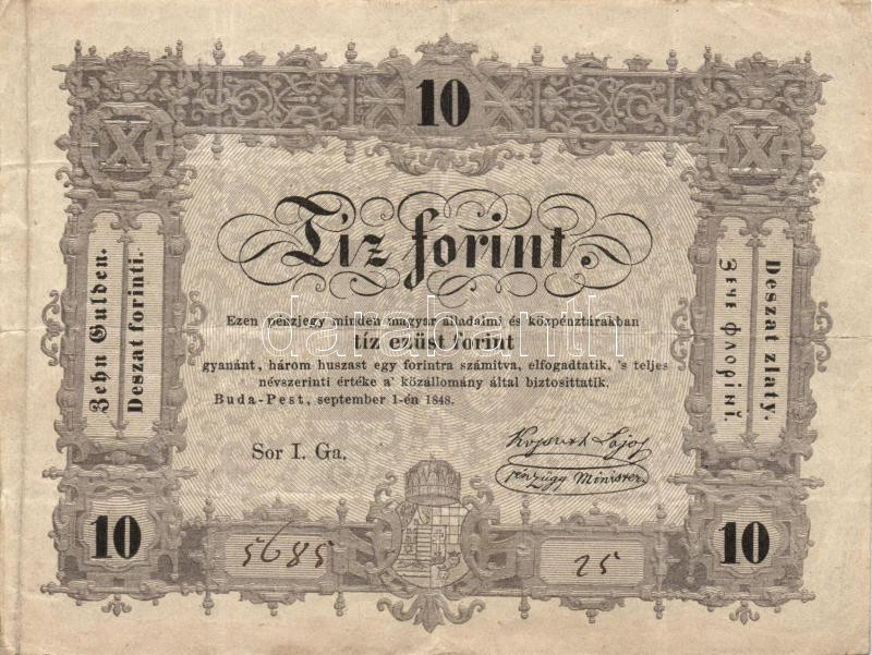 1848. 10Ft "Kossuth bankó" T:III+ https://www.darabanth.com/de/109-Fernauktion/109.0/Numismatik/~366/1848-10Ft-Kossuth-banko-TIIIplus~II274008