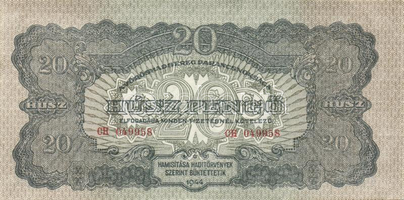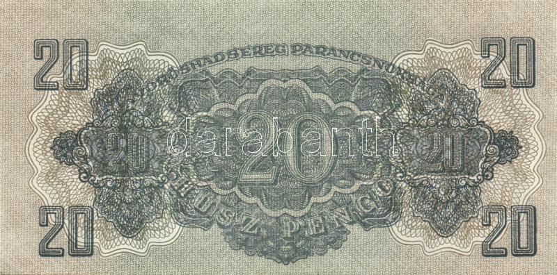 Beschreibung: 1944. 20P "V.H." elő és hátlapi nyomat erősen lefelé és balra illetve jobbra csúszva T:II+ alig látható egyszeri hajlással!