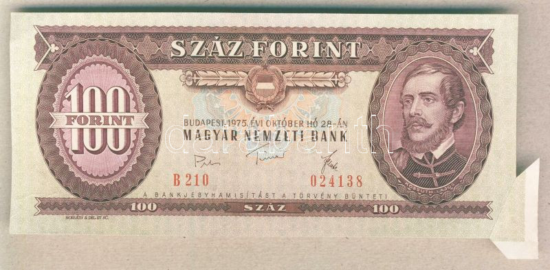 Beschreibung: 1975. 100Ft jobb alsó sarkon ívbehajlási hiba miatti vágáshiba, ívszéles többlettel T:II+