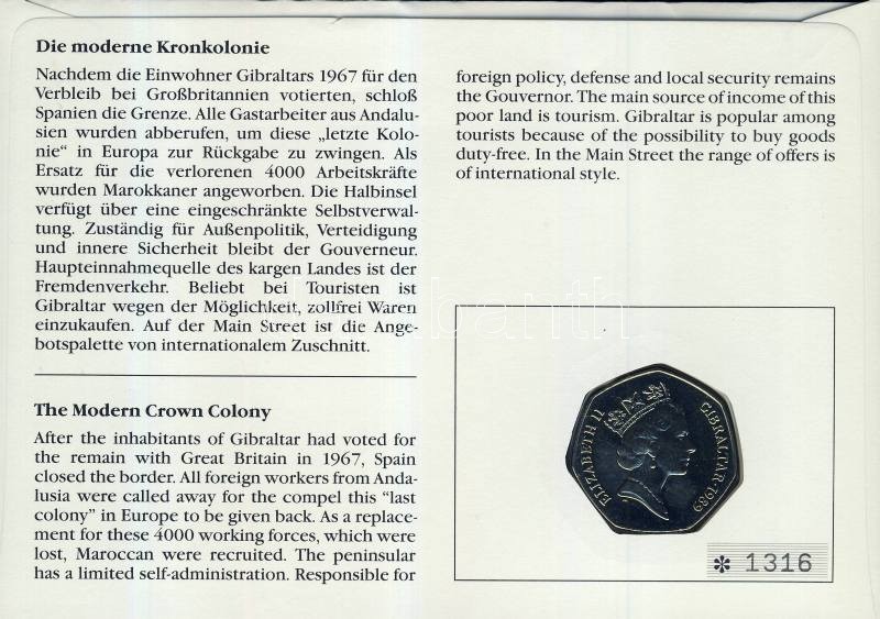 Beschreibung: Gibraltár 1989. 50p "II. Erzsébet" bélyeges érmés borítékon, alkalmi bélyegzővel T:1 hátoldali ismertetővel