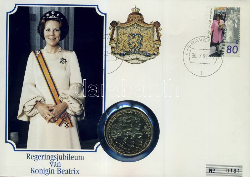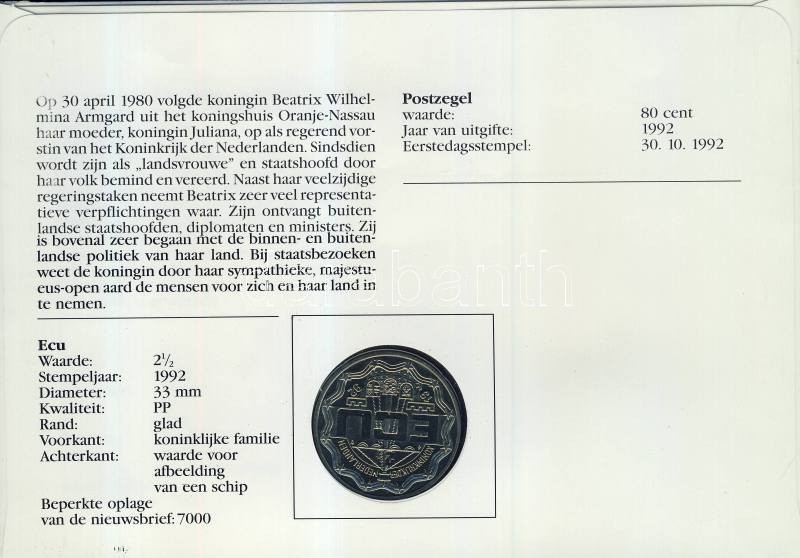 Beschreibung: Hollandia 1992. 12,5B "Beatrix királynő" bélyeges érmés borítékon T:PP hátoldali ismertető tanúsítvánnyal Csak 7000 db!