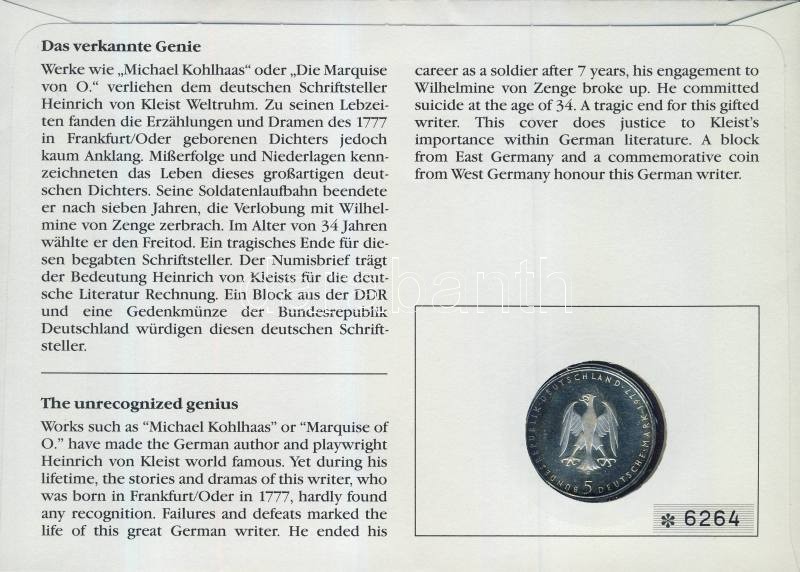NSZK 1977. 5M Ag "Kleist" érmés borítékon, NDK bélyegblokkal, alkalmi ... https://www.darabanth.com/de/109-Fernauktion/109.0/Numismatik/~367/NSZK-1977-5M-Ag-Kleist-ermes-boritekon-NDK-belyegblokkal-alkalmi-belyegzovel-T1~II271973