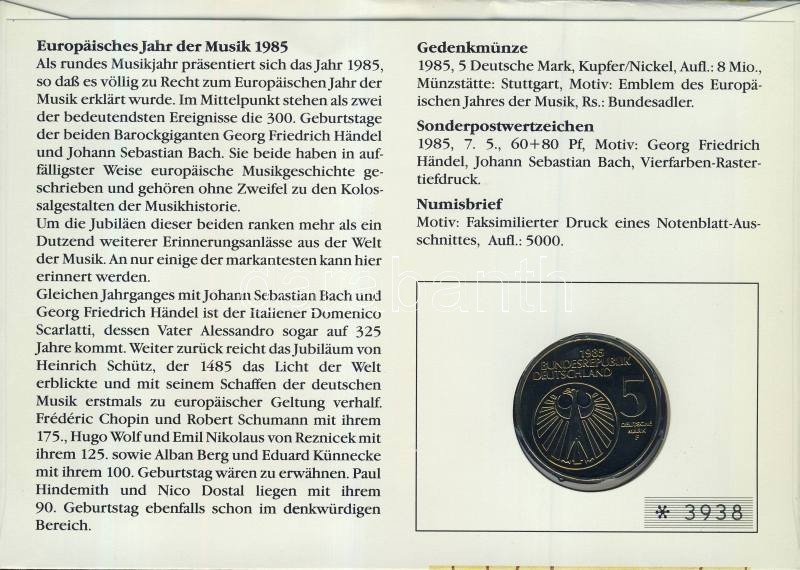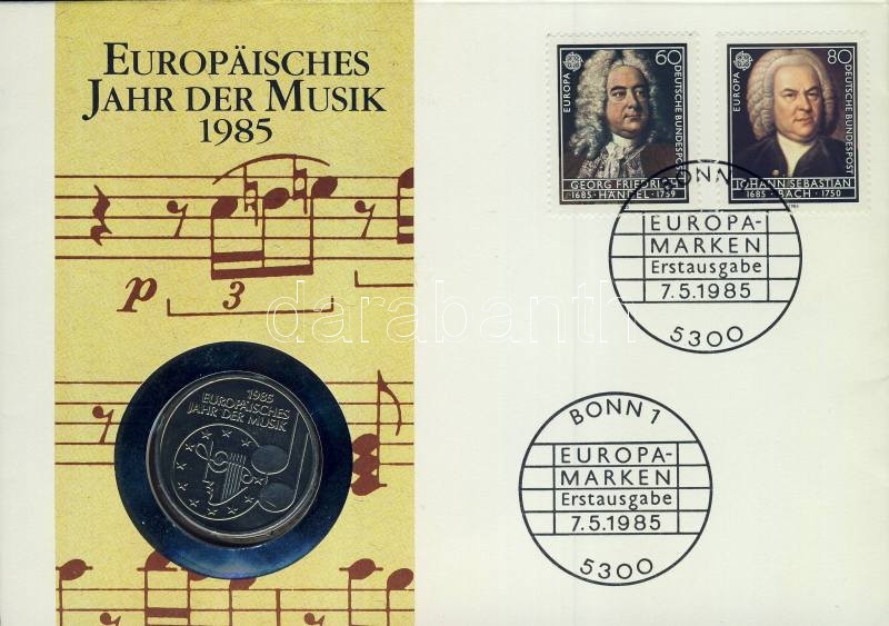 NSZK 1985. 5M "A zene éve" érmés borítékon, 2 db bélyeggel, elsőnapi b... https://www.darabanth.com/de/109-Fernauktion/109.0/Numismatik/~367/NSZK-1985-5M-A-zene-eve-ermes-boritekon-2-db-belyeggel-elsonapi-belyegzovel-TBU-hato~II271997