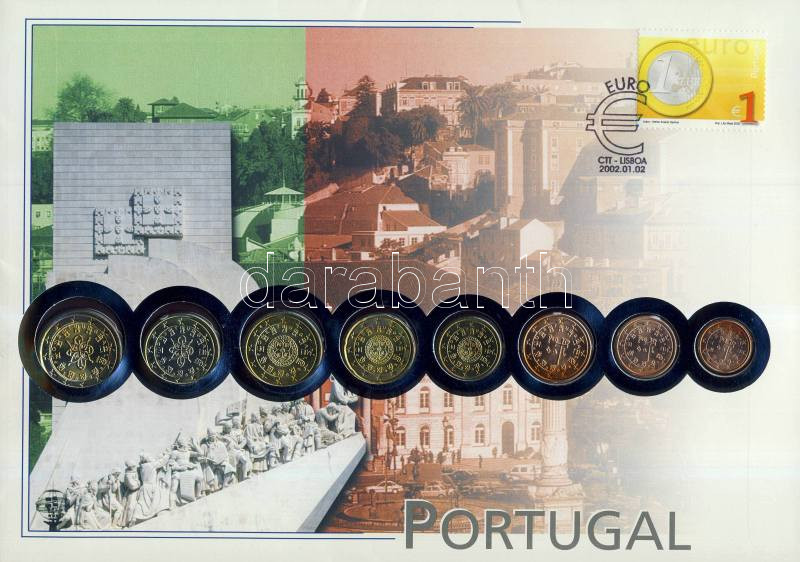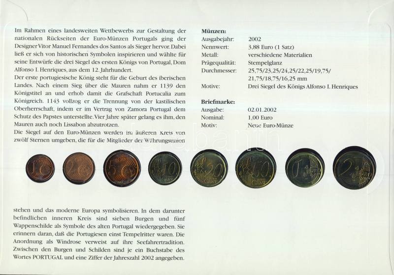 Beschreibung: Portugália 2002. Komplett Euro forgalmi pénz sor bélyeges érmés borítékon, elsőnapi bélyegzővel T:2 hátoldali ismertető tanúsítvánnyal